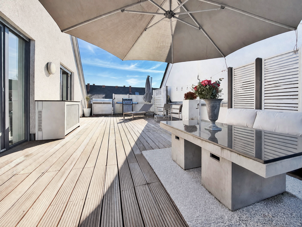 Von hier aus gelangen Sie auf die außergewöhnlich großzügige Terrasse – ein echtes Highlight, das keine Wünsche offenlässt und ein Höchstmaß an Privatsphäre sowie Wohnqualität bietet.