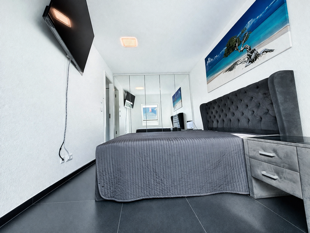 Das Schlafzimmer ist mit maßgefertigten Einbauschränken eines Schreiners ausgestattet. Das elegante Tageslichtbad präsentiert sich in einem äußerst gepflegten und hochwertigen Zustand.