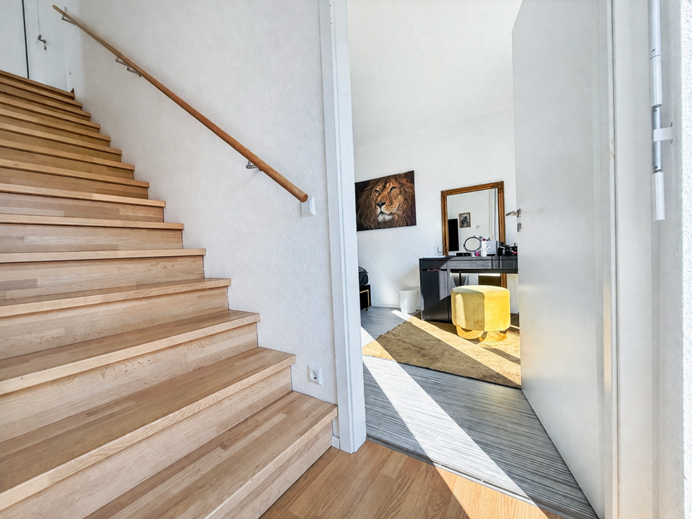 Über eine Treppe innerhalb der Wohnung erreichen Sie die darunterliegende Ebene. Hier stehen Ihnen zwei weitere Zimmer, ein zusätzliches Badezimmer sowie ein französischer Balkon zur Verfügung – ideal für Gäste, Kinder oder als Homeoffice-Bereich.